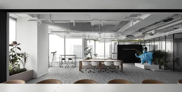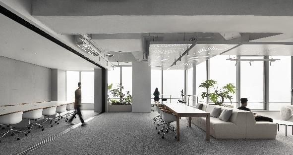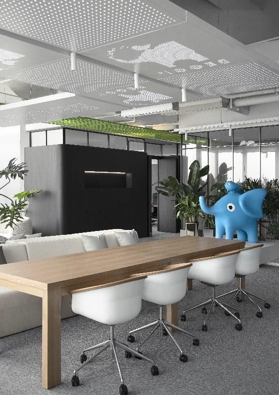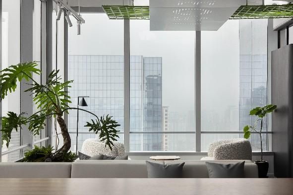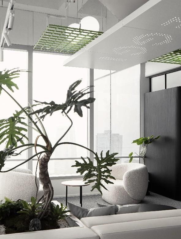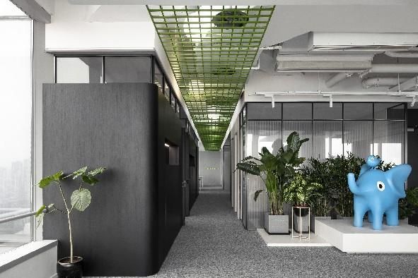 空間打造有,城市會客廳、大象吧、咖啡休閑區(qū)、無差別開放工作區(qū)及各類功能空間,通過一條貫穿各功能區(qū)的,綠色“棲廊”把各分散的空間串聯(lián)在一起。點(diǎn)綴于各個(gè)角落的綠植,為空間賦予了減壓、放松的氛圍感。