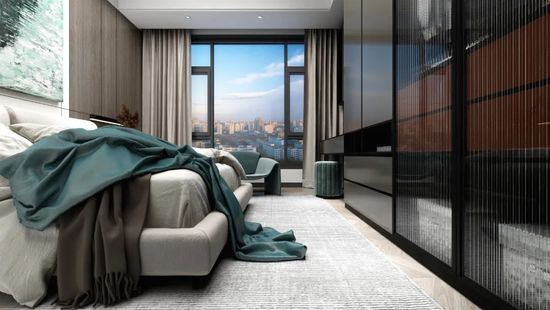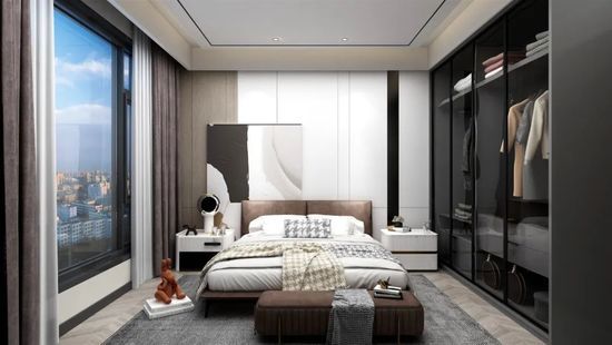 ▲TE017-5 次臥設(shè)計了一整面墻的透明式衣柜,方便衣物收納需求的同時增大了視覺空間。軟裝方面則采用了大量頗具藝術(shù)感的設(shè)計,使得整個臥室兼具了美觀性和實用性。 責任編輯:sunweiying |