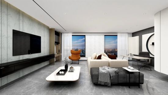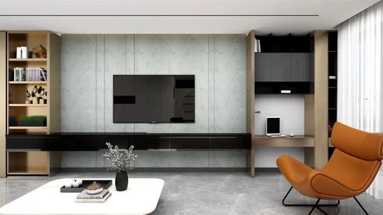 ▲JC027-2 客廳的設(shè)計同時考慮到了美觀性和實用性。電視柜懸空,清掃起來更方便。背景墻兩側(cè)做收納的同時做了一個小辦公臺。吊頂采用燈帶的手法,把現(xiàn)代風格的元素融入進去。