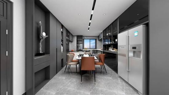 ▲B05-2 餐廳和廚房采用了當下流行的開放式布局。兩側(cè)墻面收納空間充足,質(zhì)樸天然的石材地磚、干練簡約的餐桌,圈畫出理性卻不乏溫馨的用餐空間。