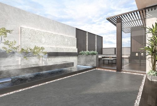 客廳 A+CZH20290180XL迪拜灰 自然風(fēng)的核心是追求材質(zhì)的天然美感,是材質(zhì)系的極簡主義,深灰色的墻面令人印象深刻,現(xiàn)代風(fēng)休閑桌椅與黑色精細金屬框架,組合出剛硬而精致的空間質(zhì)感;同時強調(diào)空間的通透感,通過半開放鐵架與庭院相連接,與自然陽光綠植同呼吸。