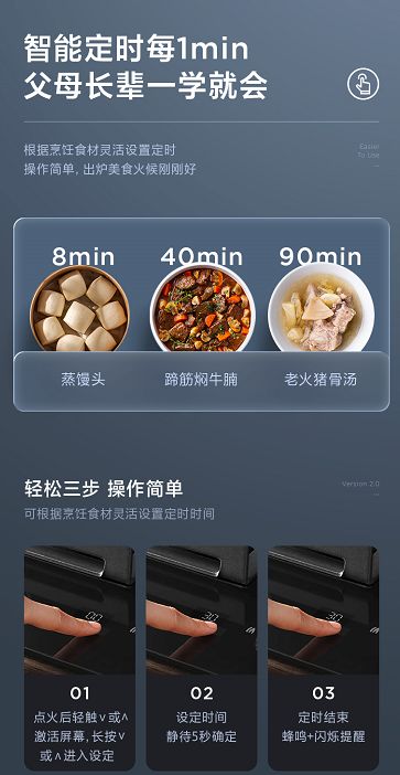 此外,它還支持多場景智能識別烹飪模式,在超高溫度下會自動熄火;開火后,120S內(nèi)無坐鍋,會自動斷氣關(guān)火;發(fā)現(xiàn)干燒情況,會立即斷氣熄火,同時會蜂鳴提醒用戶,讓爸媽輕松下廚,無需后顧之憂。 智能定時,輕松下廚更省心 傳統(tǒng)烹飪,我們需要寸步不離的在灶具前盯著菜肴、火候,不僅浪費時間,而且需要及時調(diào)節(jié)火候,操作也比較繁瑣。