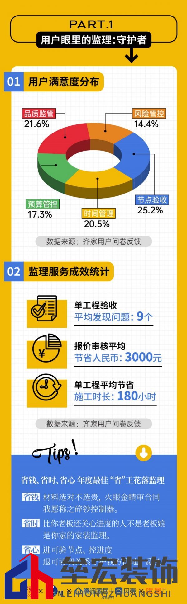 “裝修找監(jiān)理要花錢”,這可能是大多數(shù)人最為樸素的認(rèn)知,但是你如果告訴他找監(jiān)理能省錢,他或許會(huì)認(rèn)為你在忽悠他。但事實(shí)上,一個(gè)好的第三方監(jiān)理確實(shí)能在裝修中幫業(yè)主省錢,齊家網(wǎng)發(fā)布的“監(jiān)理報(bào)告”顯示,在報(bào)價(jià)審核服務(wù)上,單均節(jié)省了3000元。另一方面,使用監(jiān)理服務(wù)的優(yōu)勢不僅僅只是體現(xiàn)在省錢上,在施工質(zhì)量和效率方面也能得到很好的保障,“監(jiān)理報(bào)告”顯示,單工程驗(yàn)收平均發(fā)現(xiàn)問題是9個(gè),單工程平均節(jié)省施工時(shí)長達(dá)到了180小時(shí),也就是說監(jiān)理確實(shí)能幫業(yè)主實(shí)現(xiàn)省錢、省時(shí)和省心的目的。