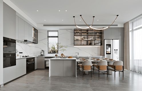 出則繁華,入則寧?kù)o。當(dāng)下都市的喧囂,難得覓一方清凈。在某些時(shí)候人們總是渴望回歸自然,或臨近于海邊;或?qū)ひ环角逖旁鹤?,自享清凈?/p> 客廳6.3M挑空的結(jié)構(gòu),讓整個(gè)視野格外開(kāi)闊,薄紗下的大開(kāi)間隔斷門讓整個(gè)采光灑在客廳對(duì)的沙發(fā)上,清透春日暖陽(yáng),分外心情舒暢。一組米灰色的沙發(fā)、水墨石材茶幾、點(diǎn)睛如青黛,于花園的景致構(gòu)成一片遠(yuǎn)山近景。高視闊步,層級(jí)遞進(jìn)的藝術(shù)水晶燈更加襯托了雍容。在電視背景設(shè)計(jì)的時(shí)候,精心打造了鋁材鋼板柜開(kāi)放空間,可增加點(diǎn)線面的結(jié)合,金屬元素于幾何線條僅是空間藝術(shù)的組成部分,也成為了設(shè)計(jì)語(yǔ)言和情感的表達(dá)媒介。 大概領(lǐng)略過(guò)精妙絕倫的自然風(fēng)景,便不會(huì)放過(guò)任何一個(gè)可以欣賞風(fēng)景對(duì)的角落,3層的品茗區(qū)在引景的手法上得到了充分的運(yùn)用。品茗區(qū)內(nèi)利用原有的結(jié)構(gòu)特點(diǎn)結(jié)合整面墻的書柜做出了一個(gè)洗手間以及茶水區(qū),暗門的運(yùn)用讓整個(gè)空間顯得合理且美觀。地面采用大面積的白色的山水紋理的巖板,山水畫簾濃淡相宜,詩(shī)書畫卷自成風(fēng)雅。一壺清茶,幾席茶座,清風(fēng)徐來(lái),亦是精神之歸處。