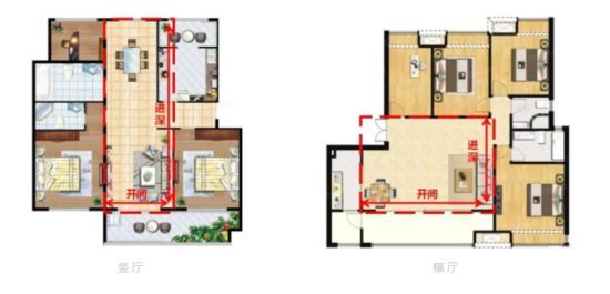 ▲奧華部分家裝案例 它到底有何魅力?遇上這種戶型又該如何裝修?今天咱就來(lái)聊聊橫廳~ 什么是橫廳 認(rèn)識(shí)橫廳之前,我們先來(lái)了解兩個(gè)名詞:開(kāi)間和進(jìn)深。 開(kāi)間:指相鄰兩個(gè)橫向定軸線間的距離。 進(jìn)深:指建筑物縱深各間的長(zhǎng)度。 我們以往接觸的常規(guī)戶型通常都是豎廳,開(kāi)間<進(jìn)深,采光來(lái)源于客餐廳的兩端,空間狹長(zhǎng)。 當(dāng)開(kāi)間>進(jìn)深,客廳與餐廳并排同面采光,空間寬敞通透,即我們說(shuō)的橫廳。