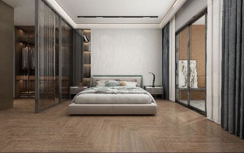 應(yīng)用產(chǎn)品:云紗深灰、海南黃花梨-黃金棕 茶室運用人字形拼木紋瓷磚,利用深色地板打造自然深邃的空間。幾何圖案為空間增加了線條感,簡單又大氣,綠樹盆栽的點綴,更是增添了空間的活力。