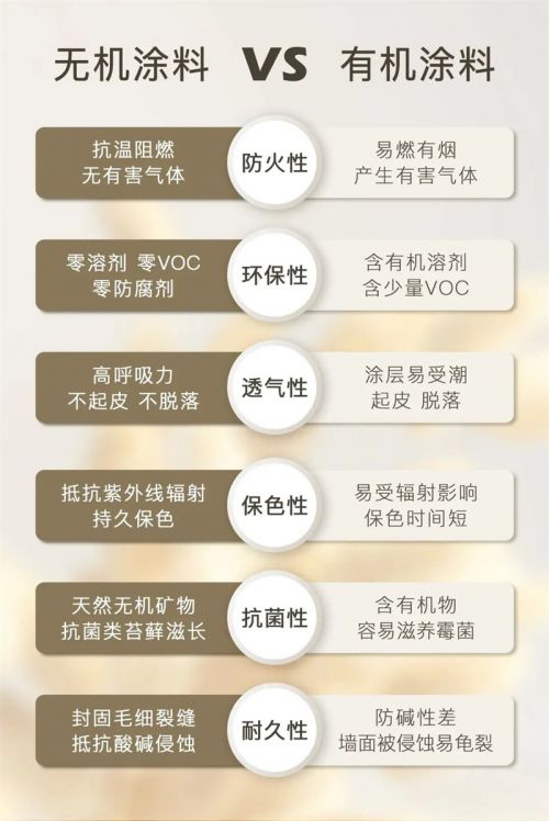 無機(jī)涂料優(yōu)勢在哪里? 1、環(huán)保無毒??梢援?dāng)天涂刷,當(dāng)天入住。 2、不起皮脫落。與基質(zhì)形成不溶結(jié)合 成為墻體一部分。 3、防腐防霉。對醫(yī)院等特殊場合有重大意義。 4、阻燃無毒。耐1200℃高溫 不會散發(fā)有害氣體。 5、耐酸耐堿。不受酸堿侵蝕 持久不褪色。 6、耐臟耐污。表面親水 灰塵積聚較慢且易被沖刷。 7、溫度調(diào)節(jié)。不受紫外線輻射影響 調(diào)節(jié)室內(nèi)溫度。
