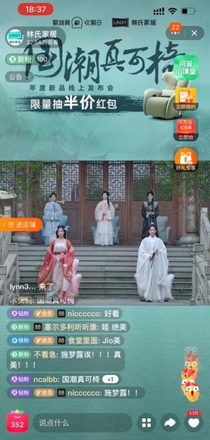 破圈傳播場(chǎng)景種草,聚合流量引爆天貓歡聚日 以傳統(tǒng)文化為溝通語(yǔ)言,以國(guó)潮新生活為內(nèi)容,林氏家居逐步擴(kuò)大營(yíng)銷(xiāo)場(chǎng)景,滲透年輕圈層進(jìn)行深度種草。 首先是林氏家居品牌全球代言人王一博為聚劃算歡聚日活動(dòng)錄制專(zhuān)屬 ID 視頻,為“國(guó)潮真可椅”種草及發(fā)布會(huì)預(yù)熱,促進(jìn)導(dǎo)流及銷(xiāo)售轉(zhuǎn)化,以代言人的影響力,撬動(dòng)粉絲泛大眾圈層,吸引年輕消費(fèi)人群目光,實(shí)現(xiàn)最大化的曝光量。