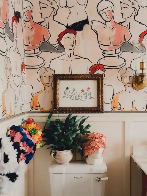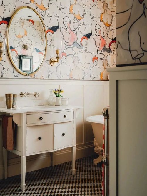 主浴室的壁紙是由?Work?&?Sea?制作的,梳妝臺是在森伯里古董市場淘的,后經(jīng)承包商?D3Lux?用曼德和日耳曼的大理石改裝的。