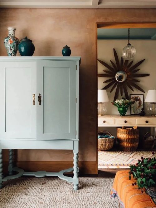 走廊的墻壁上懸掛著一面古董鏡子,鏡面結(jié)合不規(guī)則的線條,像閃耀著萬丈光芒的太陽,它是Katie?在佩特沃斯發(fā)現(xiàn)的。