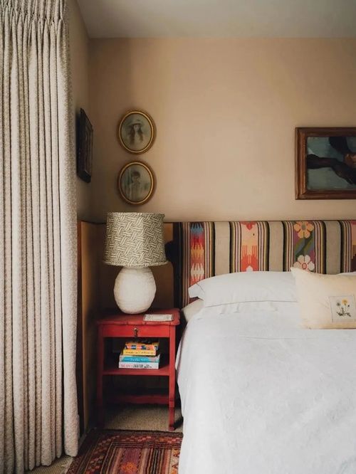 定制的花朵條紋軟包和亞麻布的靠墊,讓主臥的空間變得更加雅致溫柔。
