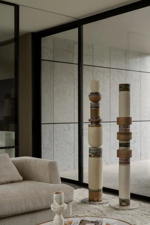 白色紗簾輕柔地遮擋窗外景色,具有朦朧美的同時,也讓整個空間更加明亮通透。窗簾上方的流線型吊燈以其簡潔的設(shè)計為空間增添了一抹藝術(shù)氣息。 于沙發(fā)旁的塔狀裝飾品,以多樣不規(guī)則的圓柱形設(shè)計拼合而成,配合米色、棕色與灰色的豐富紋理,為空間增添了層次感。金屬支架與圓形底座相呼應(yīng),彰顯了現(xiàn)代設(shè)計的簡約之美。
