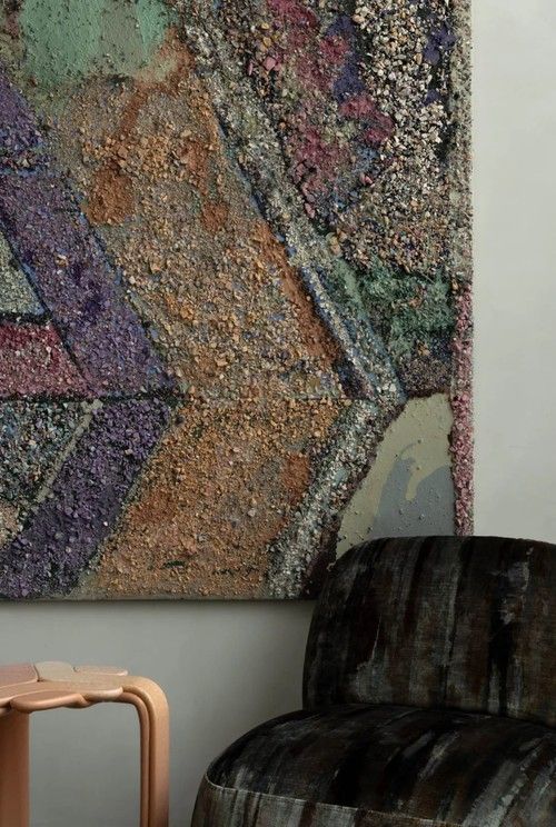 入戶口的紋理裝飾畫,以紫色、藍(lán)色、綠色和棕色的混合使用,加以粗糲的碎石營造出立體感。非對稱的不規(guī)則構(gòu)圖,給予畫作獨特的動感。與深色紋理的沙發(fā)和簡約線條感形成了和諧的呼應(yīng),共同塑造一種現(xiàn)代藝術(shù)氛圍。