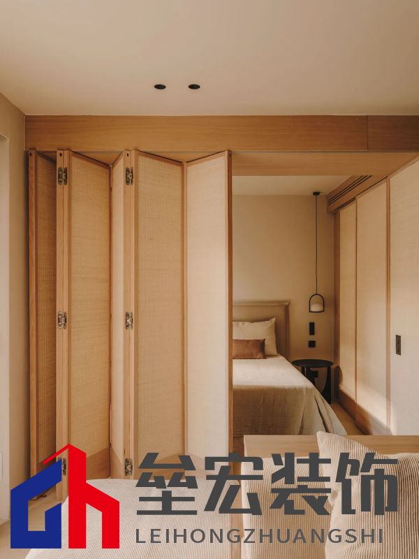 主臥室通過滑動(dòng)折疊門與起居區(qū)隔開,確保隱私的同時(shí)保留開放感。隱藏在書架后的門通向浴室和第二間臥室,為空間增添了巧妙的層次感。