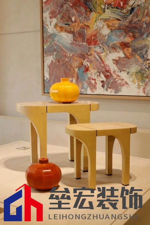 ▲展覽現(xiàn)場:一對建筑感十足的Portico?邊桌,通體由羊皮紙飾面包裹而成;搭配黃色與橘色的?Peking?Globe?花瓶 Alexander?Lamont?的重要價(jià)值不僅在于復(fù)興與傳承古典技法,更在于他賦予了工藝與材料新的可能性。本次展覽中展示了他在鑄銅、天然漆法、羊皮紙、鯊革(珍珠魚皮)與飾金等經(jīng)典工藝在當(dāng)代設(shè)計(jì)上的卓越創(chuàng)新,涵蓋了家具、燈具以及令人驚嘆的收藏級限量款作品,完美呈現(xiàn)了其對裝飾藝術(shù)的深刻理解與非凡創(chuàng)造力。