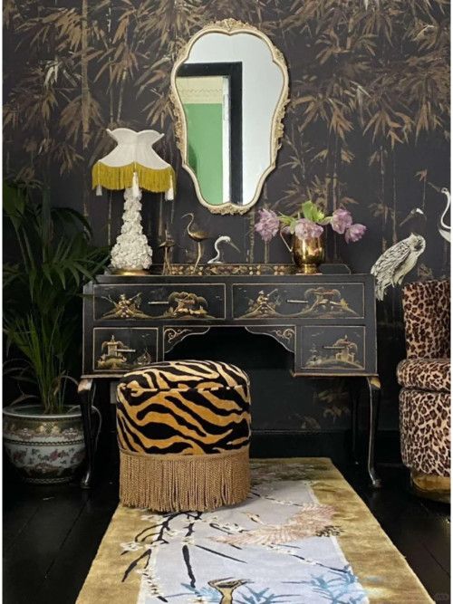 ?Martin?Brudnizki 02° 戲劇的沖突 那些看似不合理的“碰撞” 花卉、幾何、動物紋、復古印花等不同圖案混搭,無論是條紋墻紙搭配波西米亞地毯,或格紋沙發(fā)與熱帶植物壁畫結合。 天鵝絨、絲綢、金屬、藤編、大理石等不同材質的碰撞,增強空間質感,絲絨沙發(fā)搭配黃銅茶幾,或木質書架與鏡面裝飾結合,材質間的沖突感。很多時候還會看到繁復的壁紙、壁畫或裝飾線條(如護墻板、石膏線)打造“視覺轟炸”效果。 ?