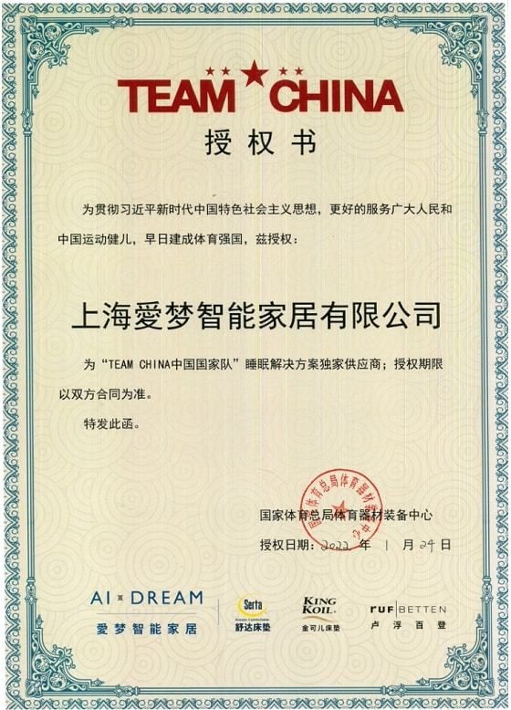 2022年1月24日,愛夢集團(tuán)攜旗下Serta舒達(dá)、KINGKOIL金可兒、RUF Betten盧浮百登三大品牌,獲得國家體育總局體育器材裝備中心授權(quán)許可,正式成為TEAM CHINA中國國家隊睡眠解決方案獨家供應(yīng)商,為70余支單項國家隊隊伍和運動員提供智能睡眠寢具、深度睡眠解決方案。