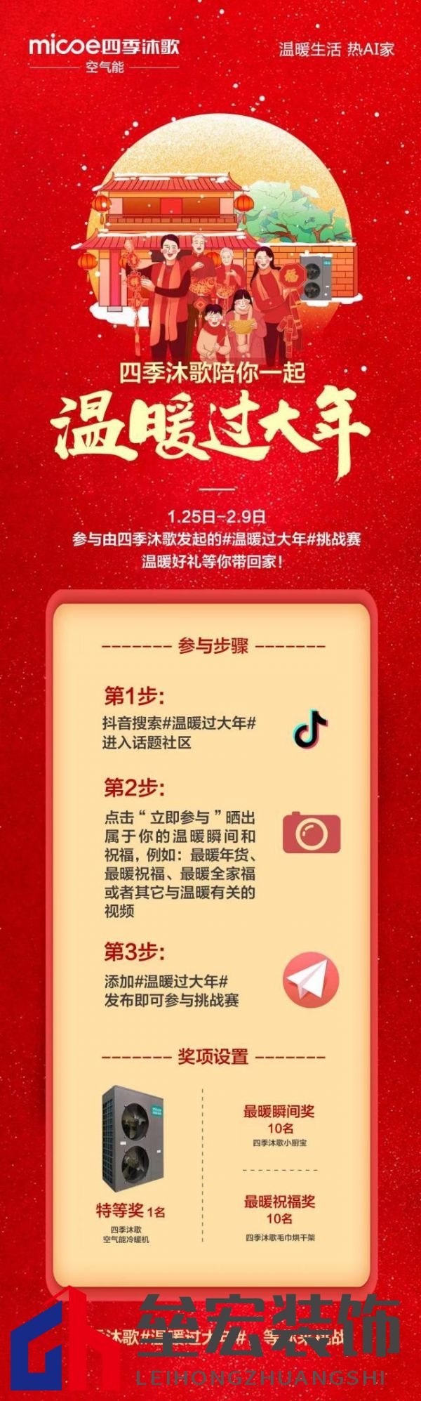 ??怎么辦?既然回不去家,那就抱團(tuán)取暖,想辦法大家熱鬧起來,用快樂與福利把原地過年的惆悵沖淡。比如,我們來首先定個(gè)小目標(biāo),例如,在千里之外,給家里添一份融融的暖意怎么樣?1月25日-2月9日,四季沐歌#溫暖過大年#抖音區(qū)域挑戰(zhàn)賽火熱開啟,一場(chǎng)集快樂分享與福利派送為一身的2022別樣新春“盛宴”正式拉開序幕。 ??抖音挑戰(zhàn)賽—暖心分享福利滿滿 ??本次活動(dòng)是繼2021年春節(jié)“過年家香味”之后,四季沐歌聯(lián)手抖音短視頻平臺(tái)推出的又一次短視頻挑戰(zhàn)賽活動(dòng),旨在用簡(jiǎn)單快捷的方式帶給參與者分享節(jié)慶快樂的機(jī)會(huì),同時(shí)奉上贏取溫暖節(jié)慶大獎(jiǎng)的機(jī)會(huì)。無論是奔波在回家路上,還是堅(jiān)守在異地他鄉(xiāng),都可輕松參加。只要你在活動(dòng)期間拿起手機(jī)打開抖音,參與#溫暖過大年#挑戰(zhàn)賽話題,點(diǎn)擊“立即參與”并曬出屬于你的溫暖瞬間與祝福,如“最暖年貨”、“最暖祝?!钡龋詈筇砑?溫暖過大年#并進(jìn)行發(fā)布,即視為成功參與挑戰(zhàn)。