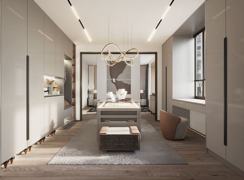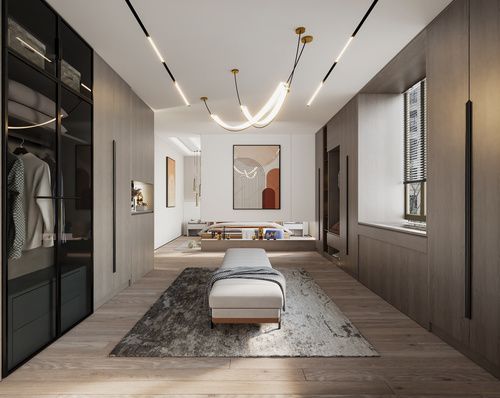 男士衣帽間設計是一種沉浸式享受,壁櫥式的輕便收納搭配淺色系的座椅,衣物在輕透的玻璃飾面呈現(xiàn),完美的呈現(xiàn)出主人精致的生活質感,淺色系的木質地板巧妙地與造型別致的燈具呼應,空間藝術感令人贊不絕口,色調柔和溫馨的壁畫和燈光注入了自在閑適的氛圍。