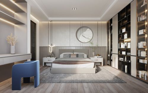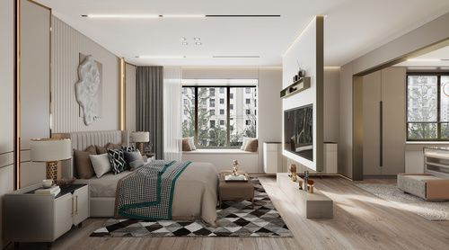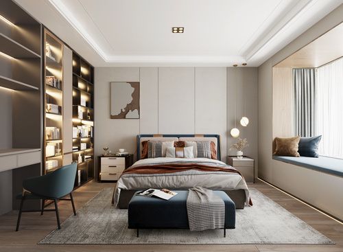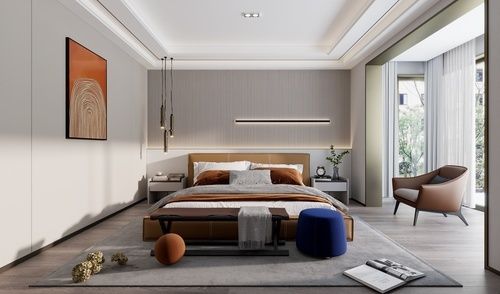 灰白色的墻面上的一抹橘色為男主人房注入了活力和力量,與暖色系的床上用品擺設遙相呼應,看似錯亂卻井然有序的擺放,大大的落地窗讓自然光照進室內,讓臥室空間看起來寬敞明亮之余,更添寧靜雅致的休憩氛圍,用設計展現(xiàn)對生活的美好向往。