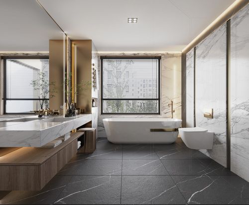 主衛(wèi)的設計尤為突出,以純白色為主調,窗戶上疊加了百葉窗元素,自然光能夠照進來還能有保留私人空間,實用性和美觀合二為一。水墨畫底色的背景墻壁緩解了視覺的審美疲勞,開放式的浴缸和馬桶設計,溫和的燈光增添了白色洗手臺和收藏柜中間的鏤空美感,黑色花紋的地面帶來幾分踏實,令人身心放松。