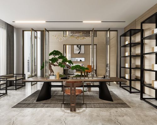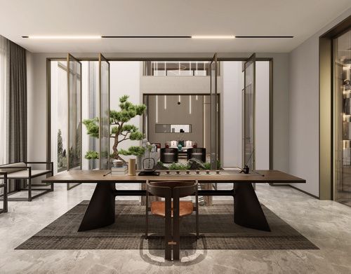 開闊的墻體設計讓整個客餐廳都充滿了自由舒適的氣息,開放式的餐桌擺放,整體顏色搭配點到為止,造型別致的燈飾結合高級典雅的軟裝陳設,呈現(xiàn)了一種韻味十足的東方之美。
