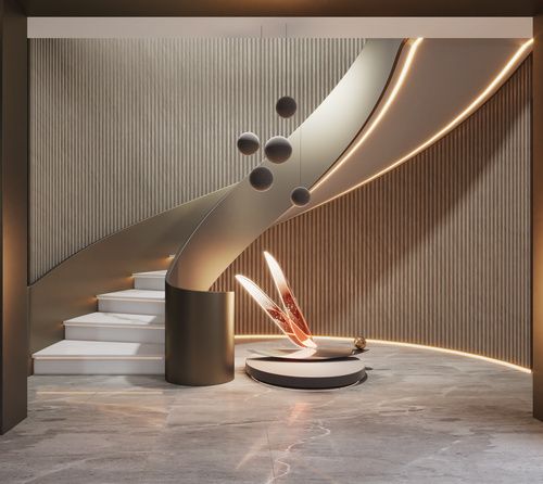 栗木色墻板/全銅整板以及柔美舒適的燈光打造出層次分明的樓梯間,光影交錯讓空間多了許多變化和驚喜。樓梯不僅在建筑房屋空間上起到了起承轉合的作用,而且遠觀猶如一條線條柔美流暢的絲帶,是藝術性的點睛之筆提高了空間的整體氣質。