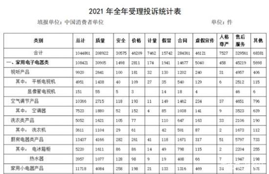| ??日前,中國消費者協(xié)會公布了全國消協(xié)組織受理投訴情況的統(tǒng)計結(jié)果?!夺斂萍肌纷⒁獾剑鶕?jù)2021年商品大類投訴數(shù)據(jù),家用電子電器類、日用商品類、食品類、服裝鞋帽類和交通工具類投訴量居前五位。其中,家用電子電器類投訴量達到10.8萬件,位居投訴榜首位。 ??有媒體注意到,消協(xié)統(tǒng)計的家用電子電器類產(chǎn)品,包括了相機、手機、PC,但即便去除這些品類,單純家電類產(chǎn)品的投訴也接近5萬件,規(guī)模十分龐大。 ??一般認為,家電產(chǎn)業(yè)經(jīng)過四十多年的發(fā)展,已經(jīng)非常成熟。無論是產(chǎn)品質(zhì)量還是服務(wù)水平,都達到了一個成熟期。理論上說,用戶投訴量不應(yīng)該居高不下。但實際情況卻是,家電類產(chǎn)品在歷年消協(xié)投訴榜上的位置都十分靠前,消費者的滿意度并不高。 ? 此外,在家用電子電器類產(chǎn)品投訴內(nèi)容中,質(zhì)量投訴和售后服務(wù)投訴最多,分別為3.1萬件和4.5萬件,占比分別為28.7%和41.7%, 超過7成的投訴指向了質(zhì)量和售后服務(wù)。