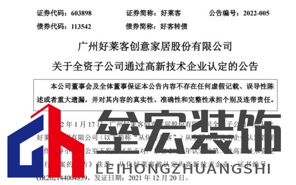 《高新技術(shù)企業(yè)證書》基本情況: 1、證書編號(hào)::GR202133004744 2、發(fā)證日期:2021年12月16日 3、有效期:3年 對(duì)公司的影響: 根據(jù)《中華人民共和國(guó)企業(yè)所得稅法》及國(guó)家對(duì)高新技術(shù)企業(yè)的相關(guān)規(guī)定,花木匠公司自通過(guò)高新技術(shù)企業(yè)認(rèn)定起連續(xù)三年(2021年至2023年)可享受國(guó)家關(guān)于高新技術(shù)企業(yè)的稅收優(yōu)惠政策,即按15%的稅率繳納企業(yè)所得稅。 五:好萊客:全資子公司廣州從化好萊客家居有限公司