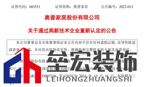 《高新技術(shù)企業(yè)證書》基本情況: 1、證書編號(hào):GR202133002641 2、發(fā)證日期:2021年12月16日 3、有效期:3年 對(duì)公司的影響: 本次高新技術(shù)企業(yè)的認(rèn)定系公司原證書有效期滿后的重新認(rèn)定。根據(jù)《中華人民共和國(guó)企業(yè)所得稅法》及國(guó)家對(duì)高新技術(shù)企業(yè)的相關(guān)稅收規(guī)定,公司自本次通過(guò)高新技術(shù)企業(yè)認(rèn)定后連續(xù)三年(即2021年至2023年)繼續(xù)享受高新技術(shù)企業(yè)的相關(guān)稅收優(yōu)惠政策,按照15%的所得稅率繳納企業(yè)所得稅。 二、奧普家居: 1月27日,奧普發(fā)布《關(guān)于通過(guò)高新技術(shù)企業(yè)重新認(rèn)定的公告》。