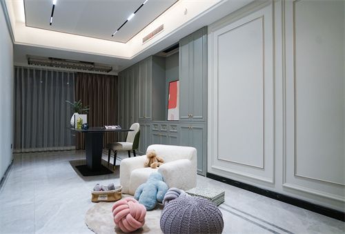 ??沙發(fā)背景墻是一堵承重墻,便將墻后的空間打造成書(shū)房兼兒童游樂(lè)區(qū)。書(shū)房地面使用與客餐廳一致的地面波導(dǎo)線,具有延伸空間的視覺(jué)感。