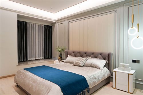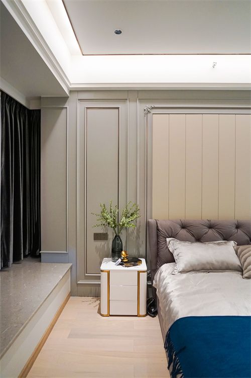 ??主/臥/ ??主臥選擇無(wú)主燈設(shè)計(jì),淺灰色石膏線背景墻,硬朗的線條與隱形衣柜相互交融,散發(fā)出沉穩(wěn)內(nèi)斂的空間氣息。作為套房,包含衣帽間和衛(wèi)生間,以流暢簡(jiǎn)約的動(dòng)線滿足居住需求。