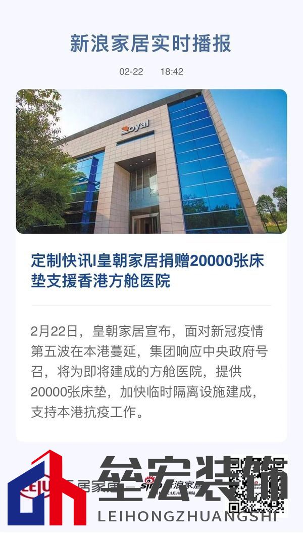 ???新浪定制頻道訊 2月22日,皇朝家居宣布,面對新冠疫情第五波在本港蔓延,集團(tuán)響應(yīng)中央政府號召,將為即將建成的方艙醫(yī)院,提供20000張床墊,加快臨時隔離設(shè)施建成,支持本港抗疫工作。