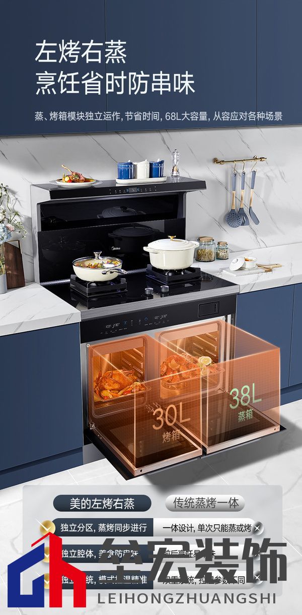 在千篇一律中尋找突破,在解決方案中覓得最優(yōu)。美的新品LS5則另辟蹊徑,首次采用頂側(cè)雙吸煙口設(shè)計(jì),9+1黃金吸力分配,形成隱形油煙隔離倉,側(cè)面吸煙口率先吸走90%的油煙,頂部吸煙口再吸走10%的殘留逃逸油煙。 “上攏吸,下近吸”,黃金25-40CM低空近吸油煙+900MM寬域進(jìn)煙距離,再配合21m3/min的極速大風(fēng)量,讓油煙剛產(chǎn)生的瞬間就被阻隔和吸走,油煙吸凈率接近100%,真正做到源頭阻擊,油煙不逃逸。 第二招:雙腔蒸烤高效率的烹飪體驗(yàn) 中國人廚房普遍偏小,所以集成灶的集成屬性發(fā)揮了多種電器“合體”的功效。這也讓蒸烤一體集成灶逐漸流行。 但是從一些消費(fèi)者反饋的信息來看,蒸烤一體集成灶由于共用一個腔體,既要承擔(dān)蒸箱的勞動,還要盡到烤箱的義務(wù),容易造成食物串味,味道跑錯“片場”;此外,因?yàn)椴煌巢膶τ诩訜峁β实奶厥庖?,蒸烤一體集成灶烹飪效率相對更低,倘若需要較短時(shí)間內(nèi)完成多道蒸烤菜肴的烹制,有些菜就只能“排隊(duì)等待”。