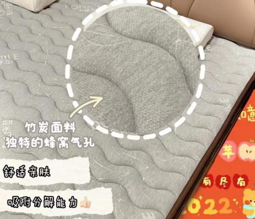 這款床墊價(jià)格處在中間檔位,性價(jià)比較高。它的正面是灰色的竹炭面料,摸上去很柔順親膚。床墊表面這種波浪形的裥花,觸感十分柔軟,當(dāng)你躺下來(lái)的時(shí)候,可以感受到像棉花一樣的包裹,舒緩你的身體重力,很適合體型偏瘦的人。