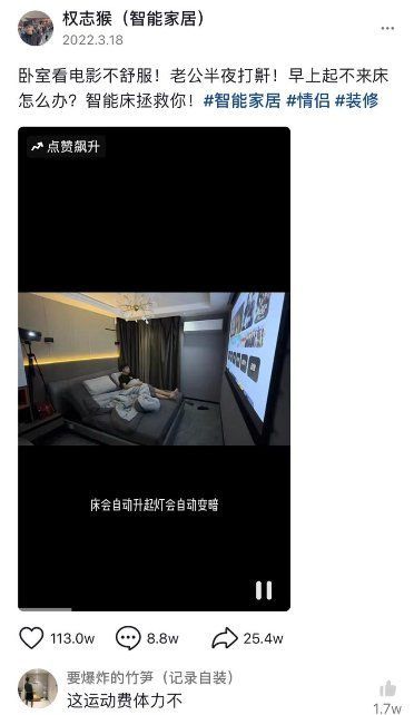 | 近日一款來自趣睡科技的智能電動床火爆某短視頻平臺,發(fā)布幾天時間點贊量已上百萬,評論量也近十萬。