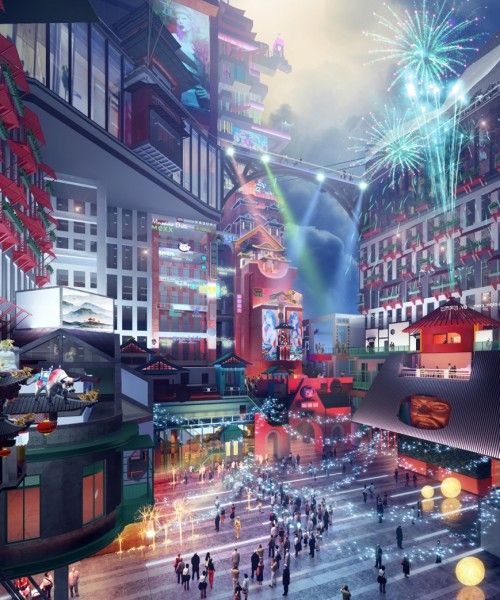 /賽博天空2077概念源自阮佳“喵喵城”(經(jīng)授權) 賽博天空2077是以2077年人類四大城邦移民火星為世界觀,在這個世界觀里,移民火星的人類為寄托對地球的“鄉(xiāng)愁”,延續(xù)血脈里的文化,將地球上最值得懷念的、美好的記憶融入了火星城邦的設計。當建筑前面加上“國潮”二字后,與其說是一種“風格”,倒不如說是根植于中國人心中的情懷和生生不息的文化傳承。后次元國潮建筑的出現(xiàn),是對中華傳統(tǒng)建筑文化的重新審視和挖掘,蘊含著國人住居的美好愿景。