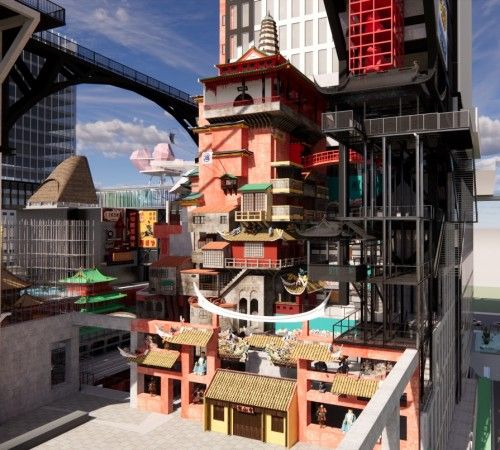 /姑蘇喵喵城局部效果圖 “姑蘇喵喵城”(賽博天空2077蘇州項目名稱)將蘇州的閶門、虎丘、滄浪亭、寒山寺、拙政園等解構并重新設計后,折疊呈現(xiàn)在一座100米高的垂直山塘街上,文財神范蠡,西施等蘇州人物故事也在科幻化的解構后融入到項目中去;以“美食迪士尼”為標準打造的許鮮市場則融入了許仙、白娘子和蟹王娘娘的故事,將“文化+”的理念根植于城市的記憶中,同時專門為Z世代人群打造了集吃、住、玩于一體化的沉浸式空間——21層通天塔,是一座擁有21層、高度達100米的游戲動漫綜合體,計劃引入18個超級IP和廠牌,每一層即一個IP或廠牌的全沉浸主題空間,打造成為“永不落幕的Chinajoy”。