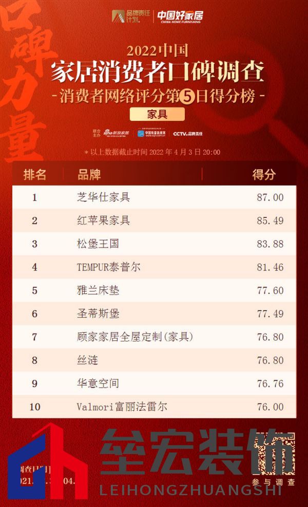 ??調(diào)查第5日,截至4月3日20時(shí),在家具榜單中,芝華仕家具以87.00分躍居第1,前一天排名第1的紅蘋果下滑至第2,第3名、第4名則仍由松堡王國、TEMPUR泰普爾占據(jù)。此外,進(jìn)入TOP10的品牌依次有雅蘭床墊、圣蒂斯堡、顧家家居全屋定制、絲漣、華意空間、Valmori富麗法雷爾等。>>點(diǎn)擊查看品類得分榜單