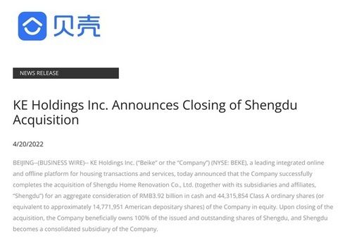 | 4月20日晚間,貝殼找房(后文簡稱“貝殼”)宣布正式完成對家裝家居品牌圣都家裝(后文簡稱“圣都”)的收購,收購?fù)瓿珊筘悮碛惺ザ?00%已發(fā)行和流通股權(quán),同時圣都正式成為貝殼的合并子公司。本次收購貝殼所花費的總代價為人民幣39.2億元現(xiàn)金和44,315,854股公司A類普通股(或相當(dāng)于約14,771,951股美國存托股份)權(quán)益。