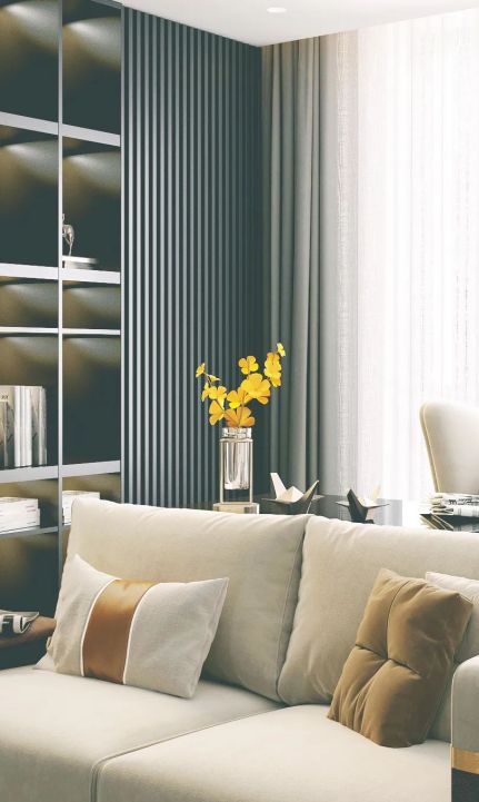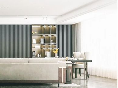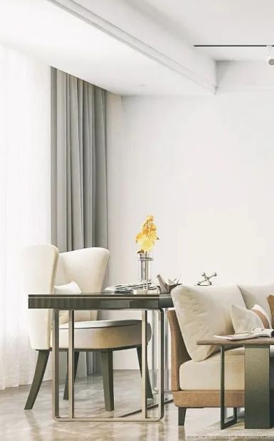 ??從沙發(fā)到陽(yáng)臺(tái),軟裝的線條婉轉(zhuǎn)浪漫,用輕奢金屬勾勒意境。 ??嵌入式書(shū)柜提升整體格調(diào),材質(zhì)與色調(diào)的變幻與桌椅在光影點(diǎn)綴下,搭配出豐富層次和質(zhì)感,讓輕奢的表達(dá)更加柔軟。