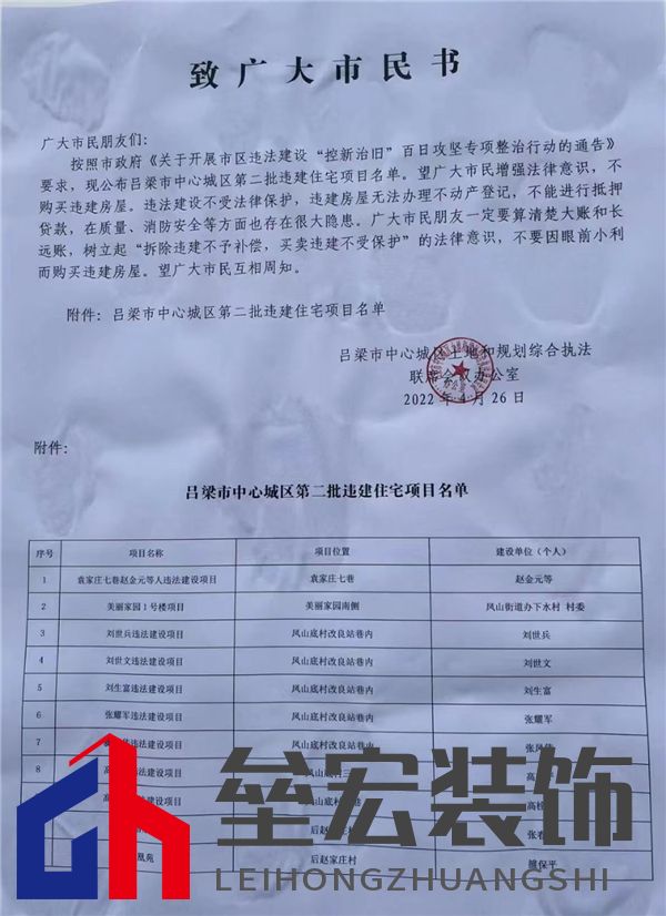 | 2022年4月26日,值山西呂梁違建拆除百日攻堅行動火熱開展之際,呂梁市中心城區(qū)土地和規(guī)劃綜合執(zhí)法聯(lián)席會議辦公室再次發(fā)布致廣大市民書,書中就呂梁市中心城區(qū)第二批違建住宅項目名單進行了公示,袁家莊七巷趙金元等人違建項目、美麗家園1號樓項目、劉世兵違法建設項目等11個違建項目赫然在列。 繼4月份百日攻堅整治行動以來,第一批違建項目已在陸續(xù)拆除中,此次,第二批名單的公布再次表明了呂梁市人民政府對違建拆除的“零容忍“,其可持續(xù)的長效機制,彰顯了呂梁市對拆除違建的信心和決心。