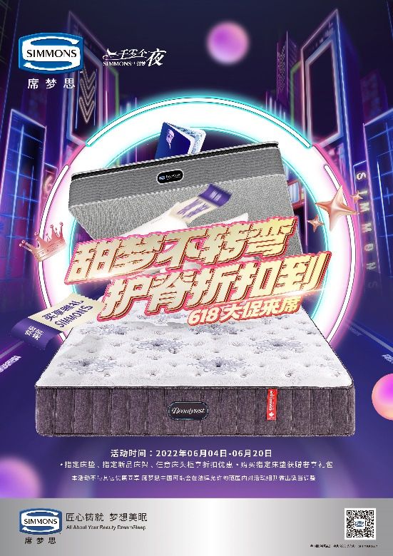 ??百年探索與沉淀讓Simmons席夢思發(fā)展為聞名全球的床墊品牌,以品質(zhì)和口碑深獲用戶信賴。核心技術(shù)“Beautyrest甜夢獨立袋裝彈簧科技“,每顆彈簧能單獨伸縮,完全順應(yīng)人體曲線,承托身體各個部位,讓人體各部位感受到均勻的支撐與回彈,舒緩緊繃的肌肉,讓人快速進入深沉的熟睡狀態(tài);特殊的彈簧形狀,能有效減低因睡姿轉(zhuǎn)換產(chǎn)生的震動,減少同床伴侶翻身所帶來的干擾,享受整晚舒心優(yōu)質(zhì)睡眠。 ??BackCare護脊系列針對亞洲人身形而設(shè)計,通過對亞洲客戶睡眠需求的深刻洞悉和不斷探索,結(jié)合這一區(qū)域的氣候情況、人群的睡眠環(huán)境、睡感喜好,量身定制產(chǎn)品,以品牌核心科技全方位的為用戶修復(fù)身心。 ??618年中大促限時開搶,Simmons席夢思兩大床墊系列:Beautyrest甜夢系列和BackCare護脊系列,全線享折扣,再疊加贈品!以護脊甜夢,開啟全新睡眠體驗!