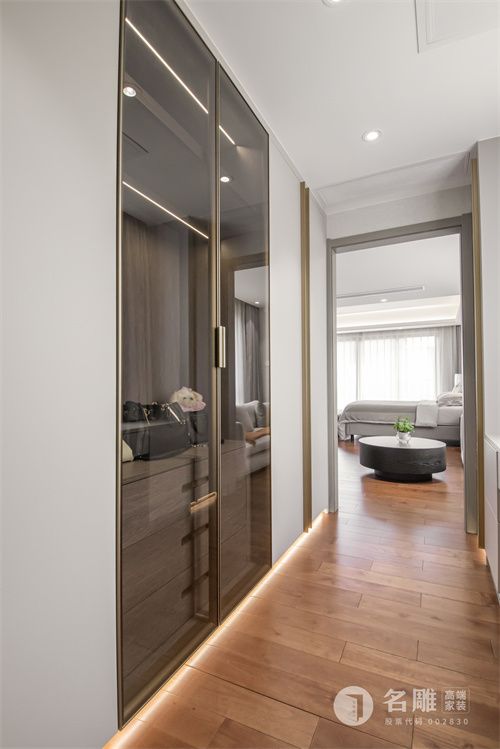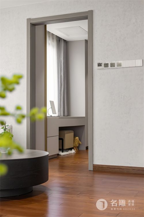 ??比起傳統(tǒng)區(qū)域封閉的硬朗,本案不設(shè)門阻隔的手法隨性自如,梳妝臺+衣帽間的過道型設(shè)計,滿足收納需求之余,空間感開闊。