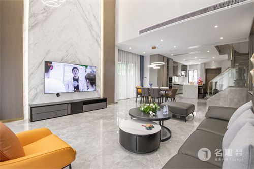 ??從入戶延伸,摒除區(qū)間邊界,以開放式姿態(tài)糅合重塑,擴大視野尺度,光透過紗簾傾瀉而下,建筑內(nèi)暖度升溫。 ??大面積留白瓷磚,灰白主調(diào)搭配同色系家具,藍色水墨背景畫和橙黃點綴其中,沉穩(wěn)不失活躍。茶幾的圓弧處理,木飾面和隱藏燈帶等,都是精心細節(jié)。 □ □ □ “ 自由、開放、愛與食光 ”