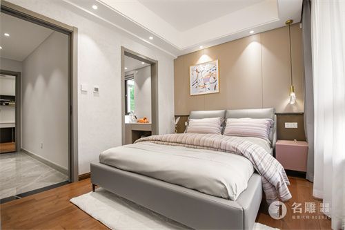 ??保持與客廳調(diào)性,主臥打造成多功能生活區(qū),集合酒水吧臺、休閑區(qū)、衣帽間,布局有序,自成天地。 ??主臥位置優(yōu)秀,陽光飽和,無主燈增添光度,床品沙發(fā)皮質(zhì)棉麻材質(zhì)作用,墻面藝術(shù)涂料印透的自然質(zhì)感,將其簡雅屬性拉至滿分,彰顯主人不俗品位。