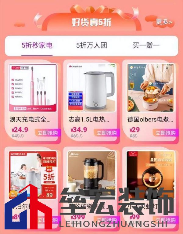 ??進(jìn)入好貨真5折專區(qū),各種半價(jià)商品一目了然,5折大牌家電、5折萬人團(tuán)、還有買一贈(zèng)一專區(qū),花一份錢輕松解鎖雙份快樂,件件超值,閉眼可入。