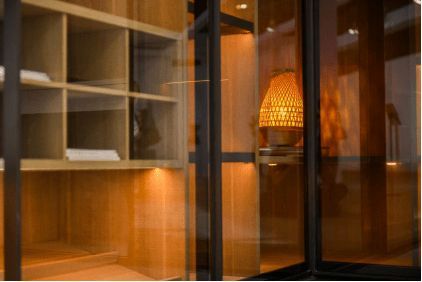 搭配上歐茶色的玻璃移門,讓整個(gè)空間藝術(shù)的氛圍感更濃烈了幾分,在凸顯出柔和細(xì)膩氛圍的同時(shí),也呈現(xiàn)出簡(jiǎn)練有力的線條,一強(qiáng)一弱的細(xì)節(jié)搭配,既烘托出強(qiáng)烈的主題氛圍,又能釋放空間的豐富性。
