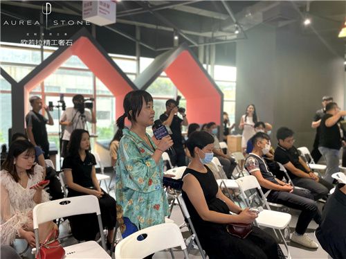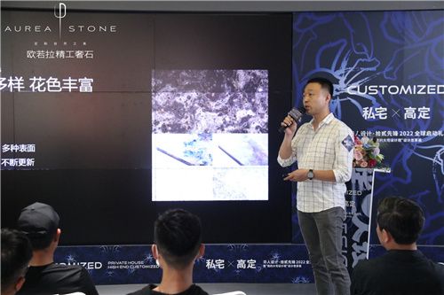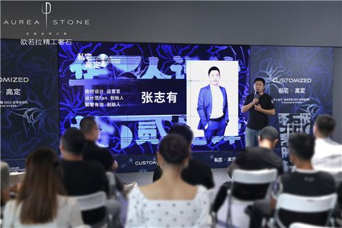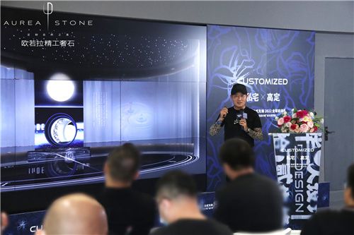 隨后,歐若拉精工奢石總裁丁國興先生為現(xiàn)場嘉賓帶來關于歐若拉的品牌故事。從0.618黃金分格比例,到歐若拉品牌的誕生,作為精工奢石全球第一、市場唯一的品牌,歐若拉擁有包含大理石、奢石、水泥、金屬、木紋等品種多樣及花色豐富的產品體系,物理性能卓越,可厚可薄,可彎可透……