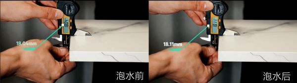 ??Part3 ??性能考驗:實用美學主義,可鹽可甜的實力派 ??【實用耐用】 ??既然宣稱不變形不起泡,那我們就模擬極端潮濕的氣候,看看這款板材的性能。 ??我們將一塊板材提前浸泡了24小時,觀察這塊板材在極端潮濕環(huán)境中的變化。肉眼可見,這塊泡了24小時的板材完全沒有開裂變形的跡象,用游標卡尺測量厚度也可以發(fā)現(xiàn),泡水后的板材與干燥板材的厚度差也沒有超過0.15毫米??梢婏椖馨宓?層芯材+高溫熱壓一體成型工藝確實能讓板材更緊致,穩(wěn)定性更強。